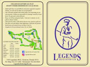 Selected in the January issue of Florida Golf Central Magazine as Number 1 in the list of Top Ten Golf Courses in Central Florida for 2002, this course is destined to continue to be recognized as one of Florida’s finest courses. In a recent issue of Lihn’s Orlando Golf Guide, Legends was described as “Featuring vertiginous elevations, cinemascopic horizons and breathtaking views, this handsome addition will definitely elevate your spirits”.
